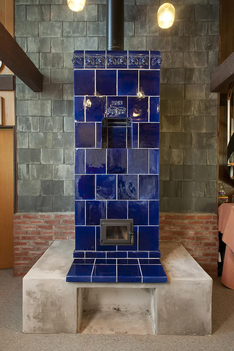 These photographs were taken before the wooden bench seats were installed on either side of the Kachelofen. The grey slate wall is offset by the vibrant cobalt blue. A warming shelf and accent tile finish off this elegant design.