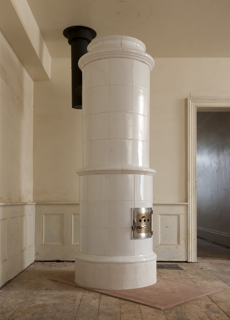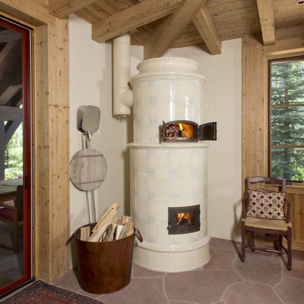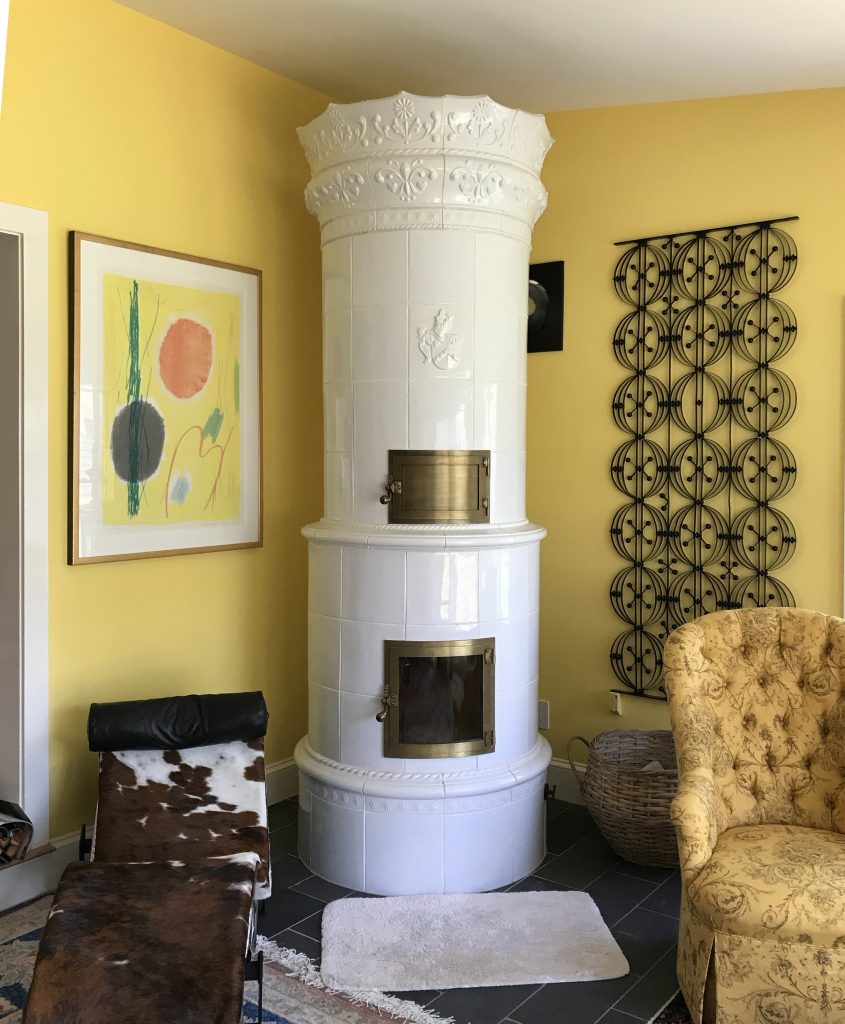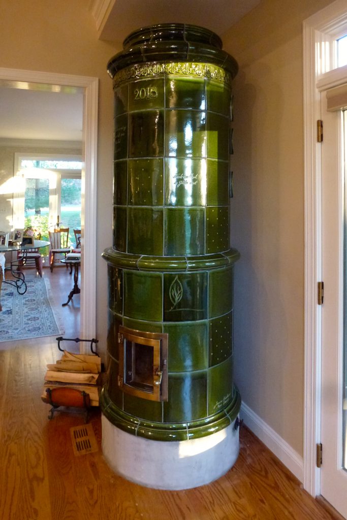 Asta’s Kachelofen features a coat of arms, custom crown and trim, as well as a warming oven.