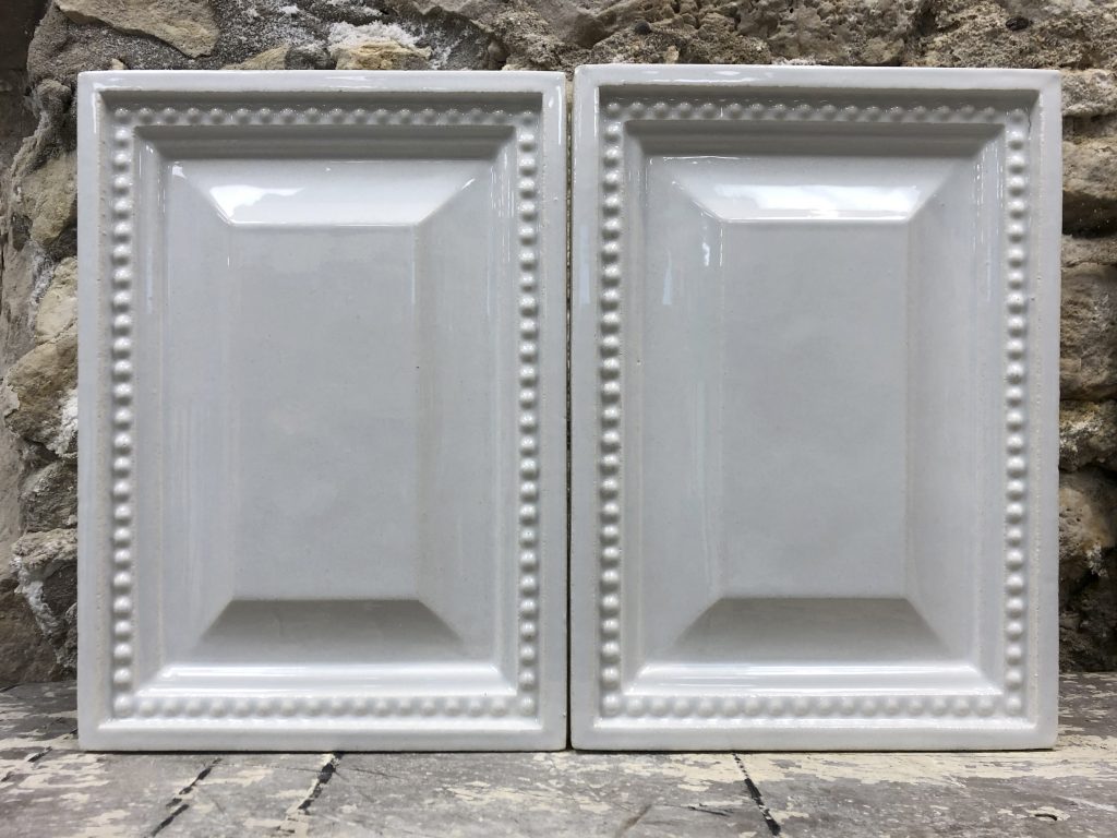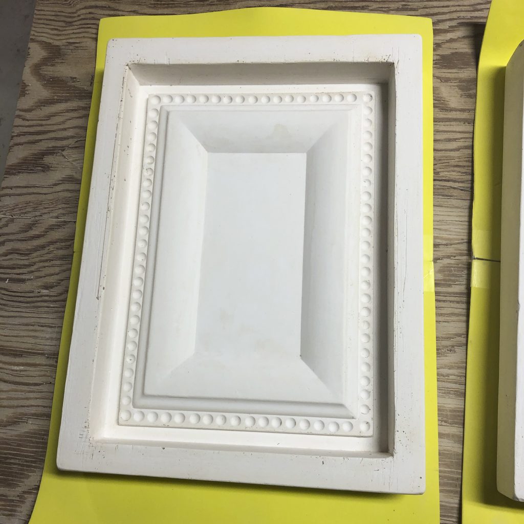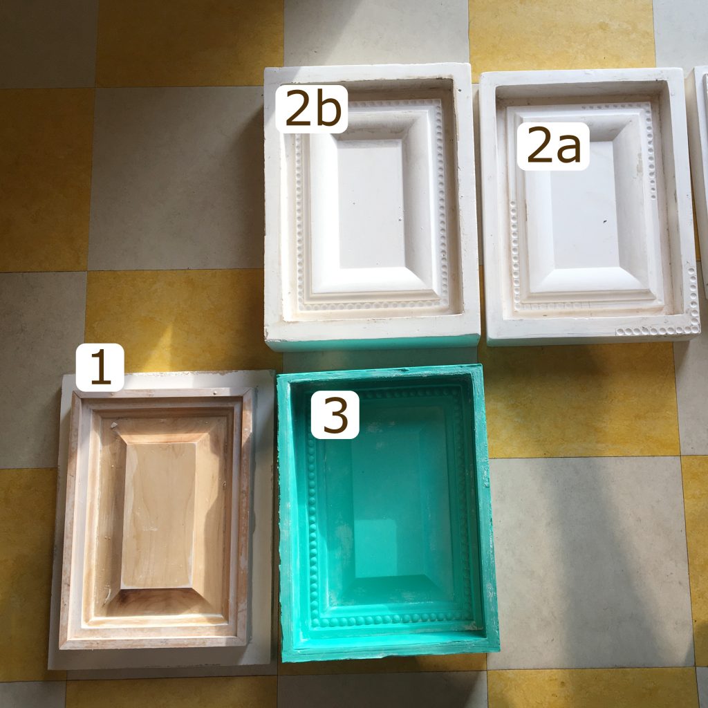 The first step was to make a positive wooden master mould (1). This mould obviously had no beading. From that we made an initial negative plaster mould. We planned to carefully drill rounded indentations into this mould using a drill press to create the beading (2a). It took quite a long time to find the right bit and determine the correct depth for the holes. Some of the test holes and mistakes can be seen in this photo. In the end we were able to find a router bit that worked perfectly. That gave us a master negative mould (2b). The final design called for 125 kachel, so we needed more than just one working mould. From the master negative mould we cast a positive out of silicon (3). Silicon is more durable, and would allow us to more easily make multiple working moulds.